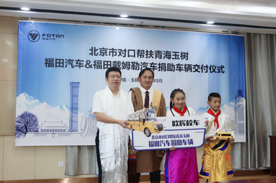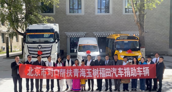 北京市对口帮扶青海玉树福田汽车&福田戴姆勒汽车捐助车辆交付仪式在玉树举行北京青海玉树指挥部党委书记、指挥,州委常委、副州长袁浩宗、怀柔区经信局副局长肖东亮、怀柔区经信局产业发展科科长杜艳丽、玉树州发改委党组书记、主任尕玛才仁、福田汽车集团党委副书记吴海山、福田汽车集团品牌副总裁、新闻发言人李健、福田汽车集团业务副总裁、欧辉客车事业部党委书记、总裁梁兆文等领导参加了本次交付活动。