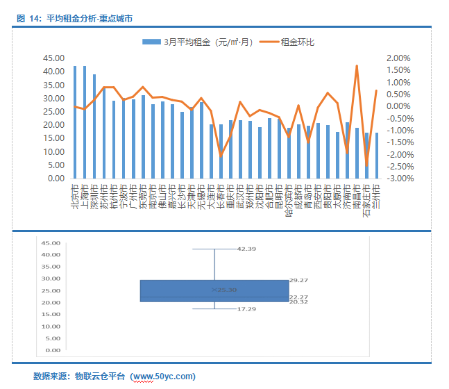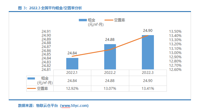 2022年3月份平均租金24.90元/㎡·月,空置率13.41%;平均租金环比上涨0.10%,空置率环比上涨1.28%。