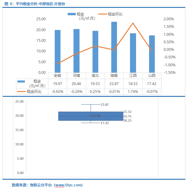中部省份租金中位值19.75元/㎡·月,平均租金区间范围18.25-21.32元/㎡·月;其中湖南平均租金最高为23.87元/㎡·月,山西平均租金最低为17.42元/㎡·月。江西平均租金环比涨幅最大为1.74%,安徽平均租金环比跌幅最大为0.92%。