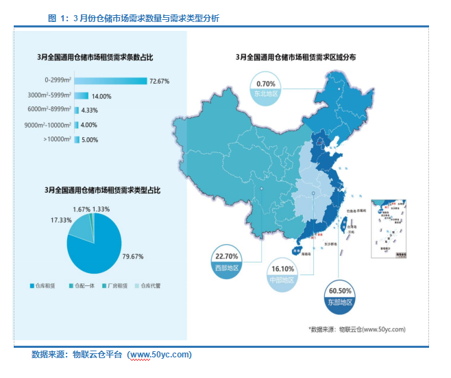 全国仓储市场中0-2,999㎡以内仓库租赁需求相对较多,占比约72.67%;9,000㎡-10,000㎡以上租赁需求相对较少,仅占4.00%。3月仓储市场需求类型主要以租赁为主,占79.67%。