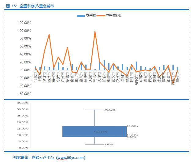 全国32个重点城市空置率中位值10.01%,区间8.40%-16.88%;其中大连空置率最高为29.52%,无锡空置率最低为2.63%。石家庄空置率环比跌幅最大为34.16%。