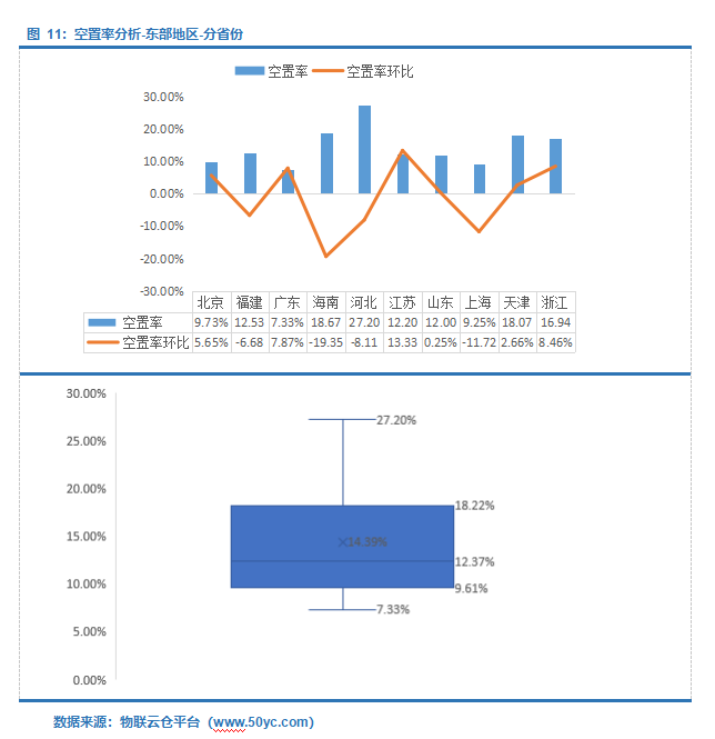 东部地区空置率中位值12.37%,区间9.61%-18.22%;其中河北空置率最高为27.20%,广东空置率最低为7.33%。江苏省空置率环比涨幅最大为13.33%,主要由于仓库新增入市拉高了整体市场空置率;海南省空置率环比跌幅最大为19.35%。