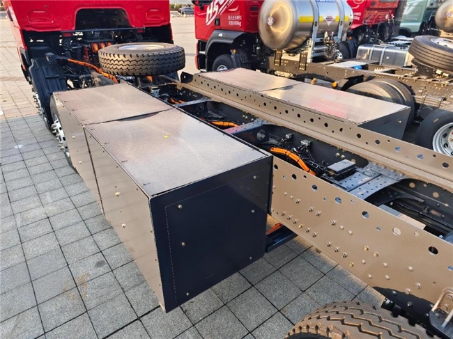 承载能力是自卸车的核心竞争力,乘龙H7纯电自卸车通过结构优化与动力升级,实现“多拉快跑”的运营需求。该车采用一次冲压成型大梁,配合双9.5T前桥与双25T 轮减后桥的超强组合,构建起足以应对极端工况的承载体系。8-9米的超长货厢设计,较同类车型装载容积提升18%,单趟运输量的增加直接转化为运营效率的提升。