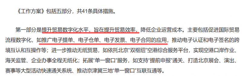 贸易领域近期也迎来电子化的好消息,商务部对外发布《支持北京市率先试行世贸组织〈电子商务协定〉工作方案》,强调要提升贸易数字化水平,通过电子单证、电子认证等方式促进贸易流程数字化,推动无纸贸易便利化应用。
