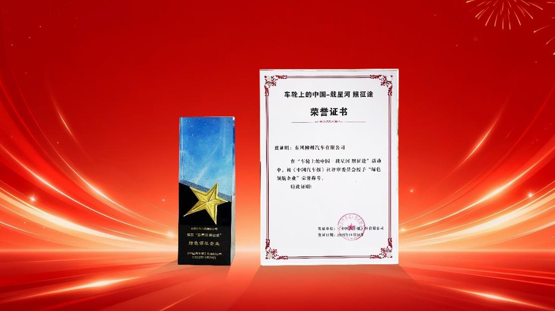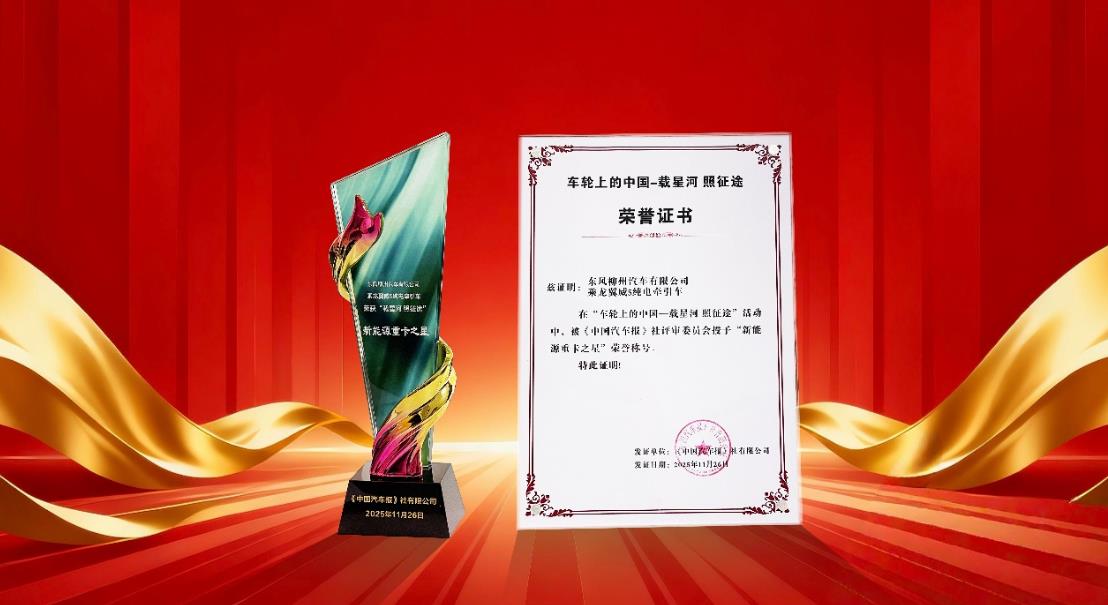 11月26日,由《中国汽车报》主办的“车轮上的中国——载星河 照征途”活动在北京举办,东风柳汽荣获“绿色领航企业”称号,同时旗下产品乘龙翼威5纯电牵引车获得“新能源重卡之星”。