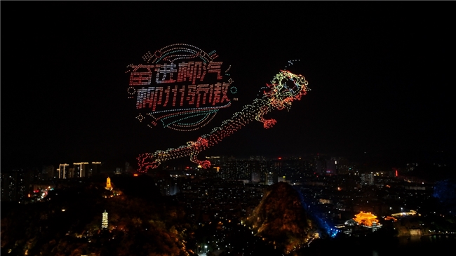 当暮色彻底漫过古镇,柳州最大规模的无人机编队骤然升空,3500架无人机集结成阵,以天为幕、以光为笔,依次点亮柳宗元、风雨桥、文庙等柳州文化符号,最终聚焦1954年东风柳汽诞生的坐标与“乘龙”“东风风行”品牌标识。这场夜空表演,是“乘龙行天下”的壮志与“心怀星海 共赴美好”的温暖交织,诉说着品牌与用户的深厚情谊,为盛会添上浪漫震撼的底色。