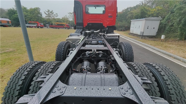 承载力是自卸车的底气。乘龙H5 6×2R自卸车采用宝钢高强度钢材打造的300(8+8)双层车架,如同坚不可摧的钢铁脊梁。其9.5吨前桥、25吨级轮减后桥及25T总质量组成超强承载组合,轻松实现多拉多赚。在悬架系统上,车辆前桥以11片板簧扛起冲击,中桥引入空气悬架调和颠簸,后桥以12+9片加强板簧构筑最后防线,无惧砂石、建材等重载运输场景。同时,车辆关键部位采用进口阀件与“三防”插件,防水、防沙、防磨损,将故障率降到最低,细节之处尽显对可靠性的执着追求,助卡友每一旅征途都信心满满。
